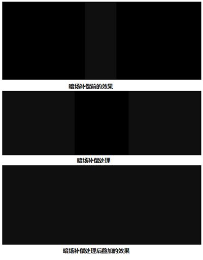 投影機(jī)的漏光,是指投影圖像為全黑色的時候,投影機(jī)仍舊有一部分光線能投射到投影幕上。這樣兩臺投影疊加以后,在純黑場的時候會出現(xiàn)一個中間亮帶。融合器需要用提升非疊加部分光強(qiáng)的方式,來抵消亮帶,這一個過程為暗場補(bǔ)償。